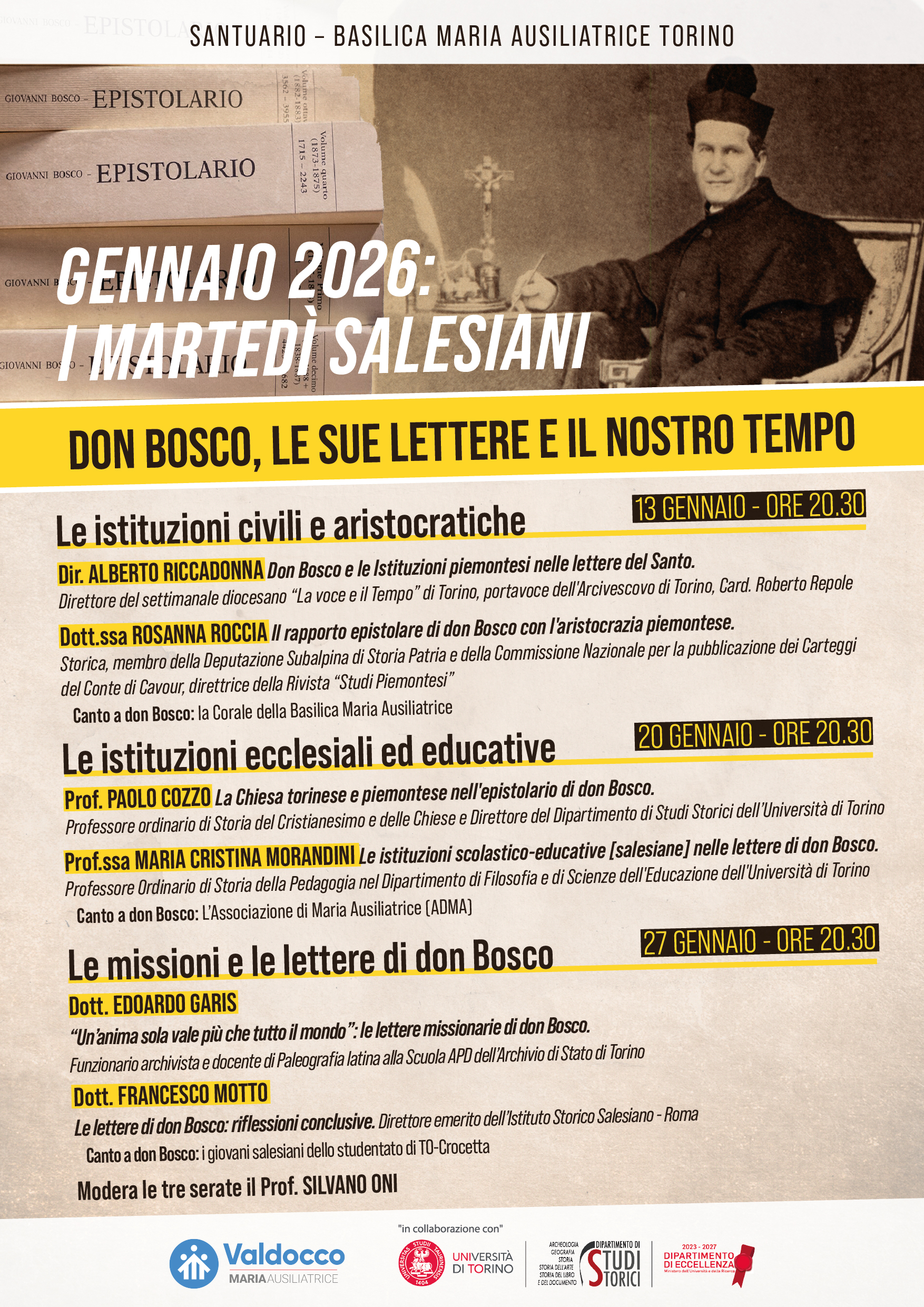 “Don Bosco, le sue lettere e il nostro tempo” è il tema che si affronta in Basilica Maria Ausiliatrice nei tre martedì 13, 20 e 27 di questo gennaio 2026 per conoscere di più il Santo torinese invocato ormai in tutto il mondo come “padre e maestro dei giovani”.